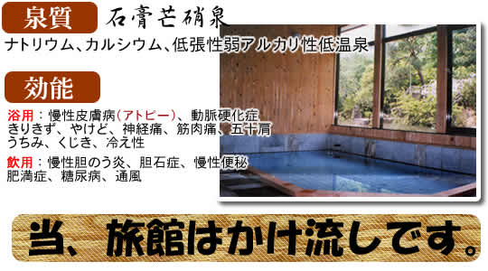 これまで多数の人々に、浴用、飲用していただき、糖尿病、痛風、胆石症、慢性便秘、慢性胆のう炎等に効き目があると話題になっております。現代病とも言われている、アトピー体質なども改善されているようです。